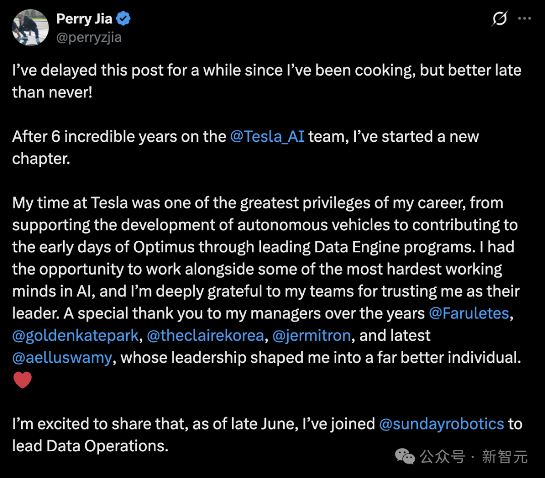 Perry Jia上周宣布,他已在今年夏天离开特斯拉,加入这家新创公司。他曾在特斯拉的Autopilot与Optimus项目中工作了近六年。