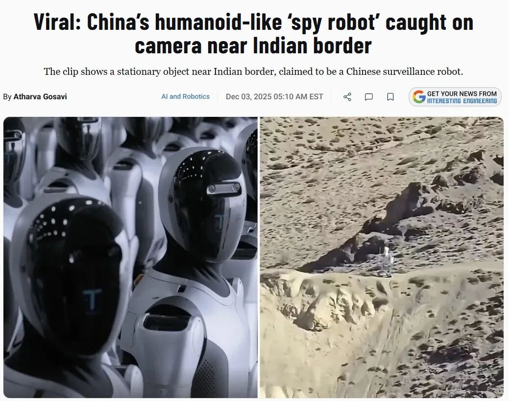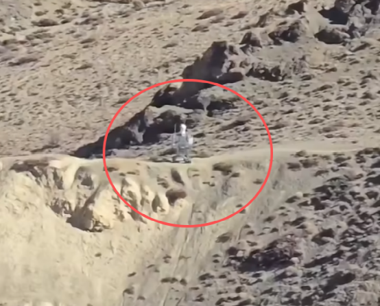 在视频画面里,镜头剧烈晃动,随后画面定格在荒芜的中印边境高海拔地区——黄褐色的戈壁乱石延伸至天际,而在山梁顶端,一个银灰色的金属身影正在安静地伫立着。