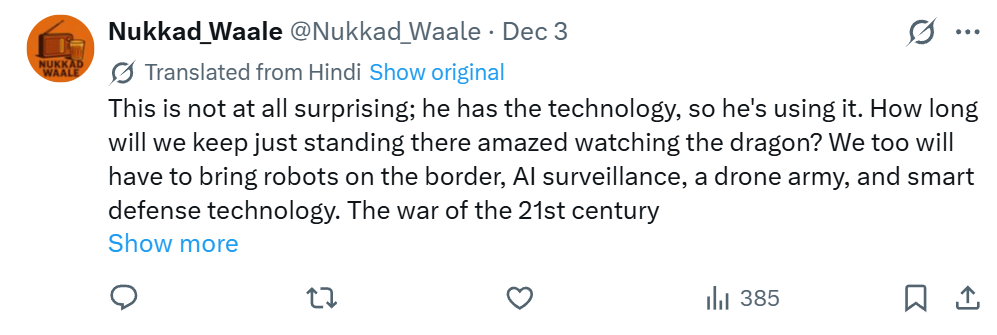 视频很快引发了国外网友热议。而这个视频的评论区里,许多印度网友对此从一开始觉得“新鲜好笑”到后来“越想越慌”,他们意识到,这或许不仅仅是一个机器人,更折射出两国在边防技术上的“代差”。