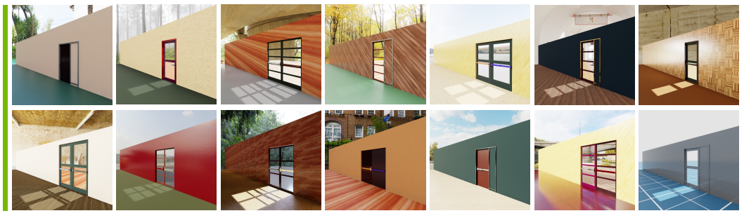 用于训练 DoorMan 的程序化生成门,涵盖门板设计、锁存机制、照明、材质等多种属性。每个并行环境均基于一组独特的门参数进行训练,最后一张图展示的是无材质的门。