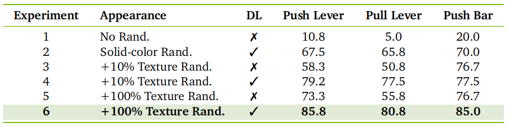 •视觉随机化的影响:完全不进行视觉随机化时,任务成功率仅为5%-20%;仅使用纯色随机化(无纹理)时,成功率提升至65.8%-70%;而加入100%纹理随机化和光照随机化后,成功率达到81%-86%。这表明高保真的视觉随机化是实现Sim-to-Real迁移的关键。
