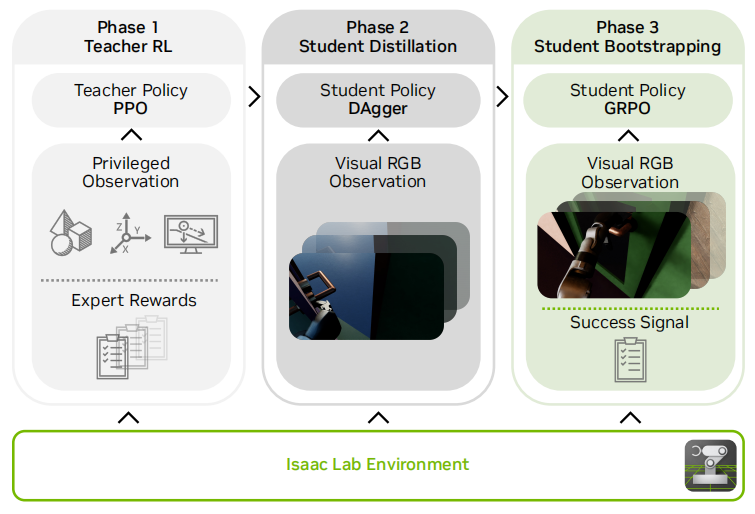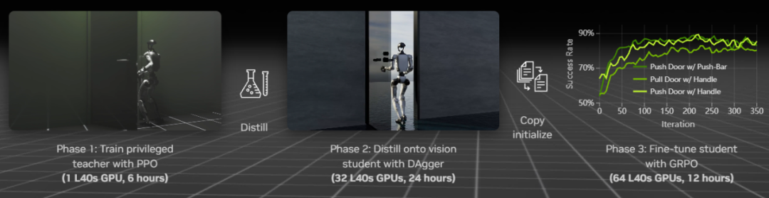 纯视觉感知必然面临部分可观测性问题——例如门把手被遮挡、相机角度偏移等情况,都会导致学生策略无法获取关键信息。为了让策略具备自我改进能力,研究团队在蒸馏之后加入了GRPO(Group Relative Policy Optimization)微调阶段。
