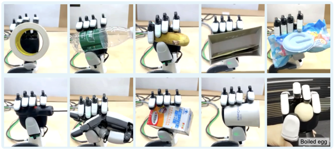 值得注意的是,该框架的核心执行部件采用了星动纪元的全直驱XHand1五指灵巧手。这款12全主动自由度的五指灵巧手在指尖配备了270°环绕式触觉阵列传感器,每个指尖拥有120个三维力传感通道,能提供超高分辨率的接触几何和分布力感知数据。支持位置、力和混合力-位置控制模式,控制频率达83Hz,指尖握力范围15N-80N,既可以实现精细的脆弱物体抓取,也能完成强力夹持,且100万次抓取的使用寿命完全满足大规模数据采集和测试的需求。此外,研究团队还在11自由度的RY-H2灵巧手上验证了框架的通用性,同样取得了明显的性能提升。