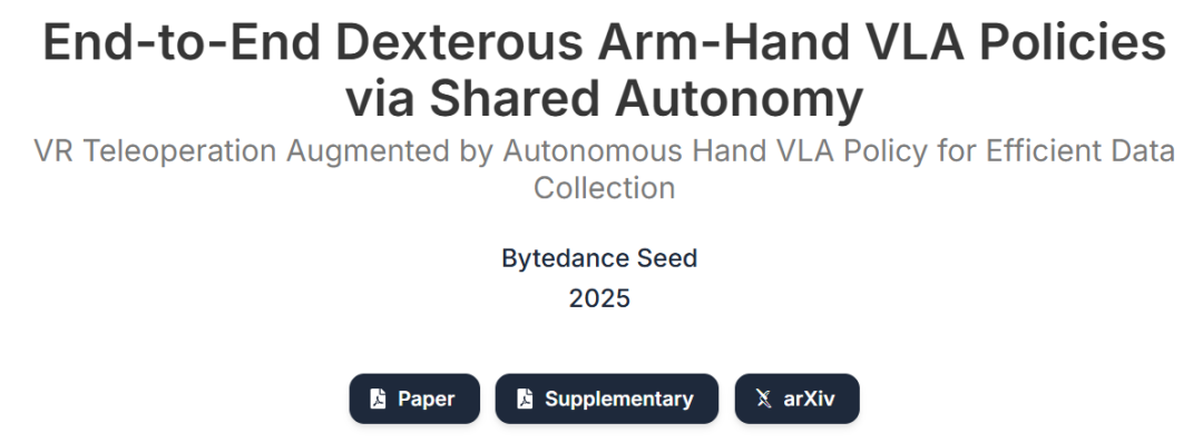 近日字节跳动Seed团队提出了一套全新的共享自主框架,通过人类VR遥操作与AI灵巧手控制,不仅解决了数据采集效率问题,更实现了端到端的臂手协同控制,在50余种物体(含未见过的物体)上达成近90%的抓取成功率,为通用机器人的灵巧操作提供了全新解决方案。目前该研究成果已发表在arxiv预印本。