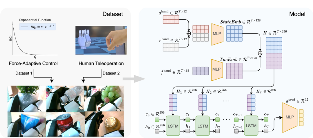 灵巧手的力自适应抓取能力源于DexGrasp-VLA分层训练策略,第一阶段聚焦训练基于LSTM的“盲抓”策略,该策略仅依赖本体感受和触觉反馈,从68条参数化力控轨迹与150条人类遥操作轨迹中学习,能够实现无视觉依赖的力自适应抓取。