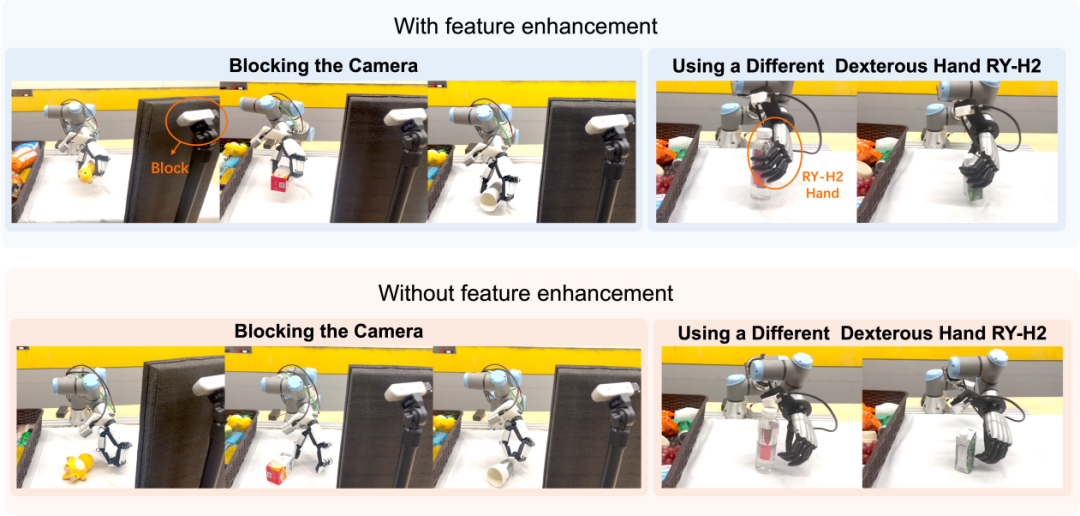 鲁棒性测试当中,在右侧相机被遮挡的恶劣视觉条件下,配备臂手特征增强模块的策略仍保持58%的成功率,而基线模型仅为19%。