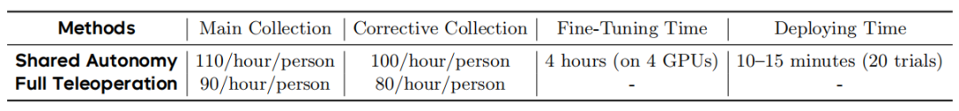 数据效率方面,共享自主框架让单操作员每小时可采集 110 条主数据集轨迹,相比全手动遥操作提升 25%,corrective 数据采集效率达 100 条 / 小时,4 小时即可完成一次策略微调,20 次评估仅需 10-15 分钟,实现快速迭代。