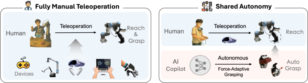 纯手动遥操作与所提出的共享自主模式(半自主遥操作)的对比