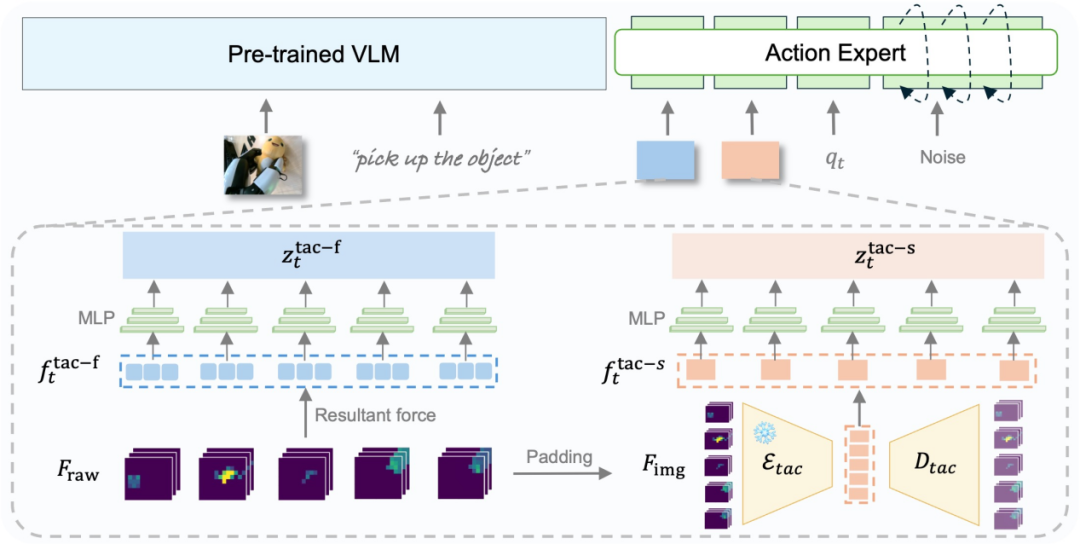 而AI则担任"灵巧手副驾",DexGrasp-VLA策略负责灵巧手的精细抓取控制。该策略融合了视觉、语言、触觉和本体感受多模态反馈,其中触觉反馈包含两个关键特征——指尖合力向量(捕捉接触力的大小和方向)和空间触觉嵌入(通过卷积自编码器提取接触分布模式),实现力自适应抓取。