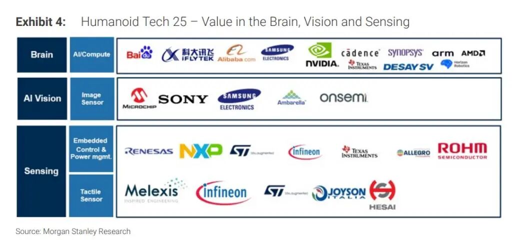 摩根士丹利将这一机遇清晰地拆解为“大脑”“眼睛”“身体”三个核心领域,国内上榜的7家企业则正好覆盖这三大领域,体现了中国在人形机器人全产业链的布局优势。
