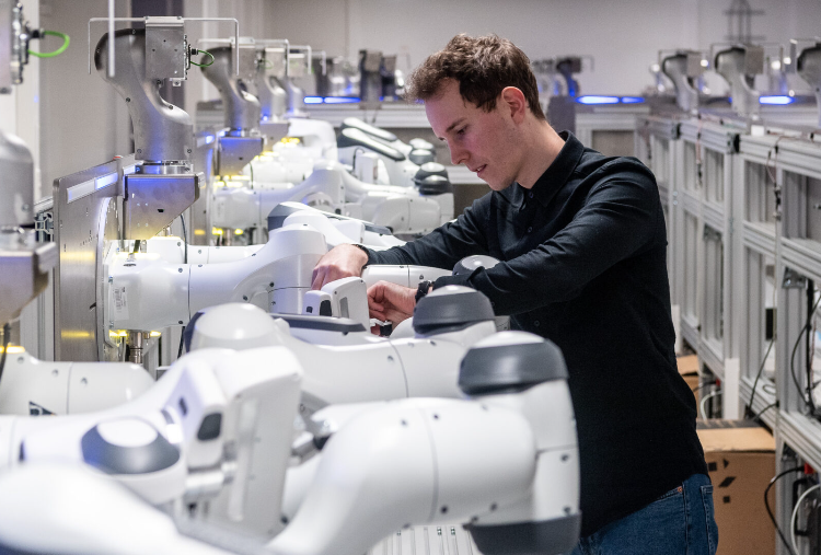 以德国慕尼黑工业大学(TUM)AI工厂为例,超过100台Franka机器人广泛用于工业数据采集、智能装配和高维操作任务验证。其7轴设计和精密传感器,使研究团队能够在抓取、组装和复杂操作任务中进行高效实验,成为欧洲最大的人工智能机器人训练中心。