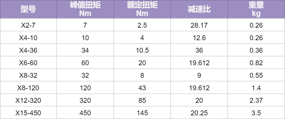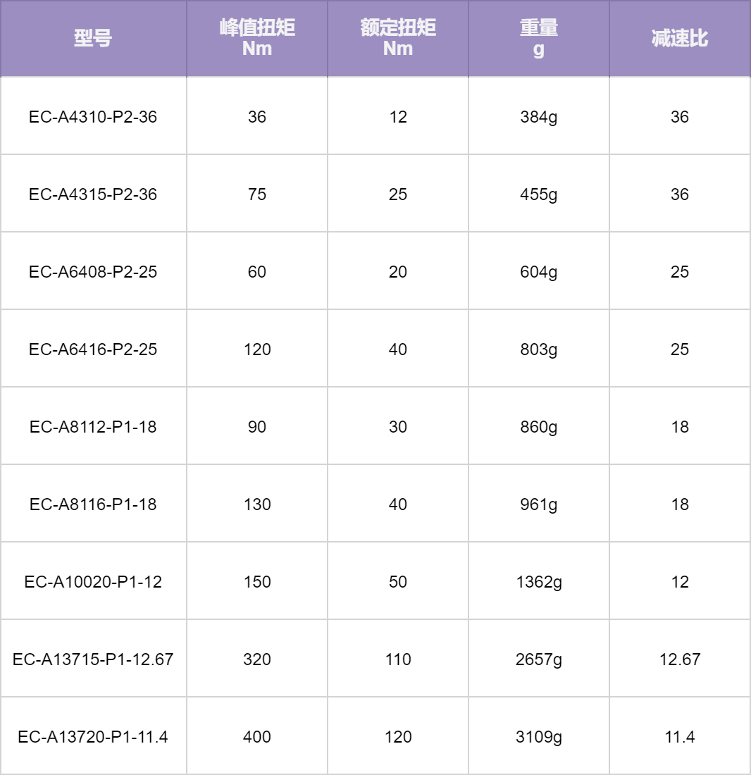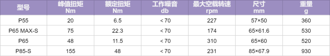 其中,行星关节模组的峰值扭矩覆盖60至360Nm,尺寸覆盖64×57.1至112×71.5mm,重量覆盖532至1900g。