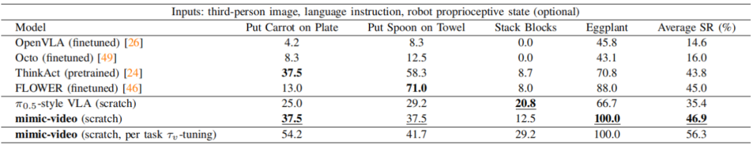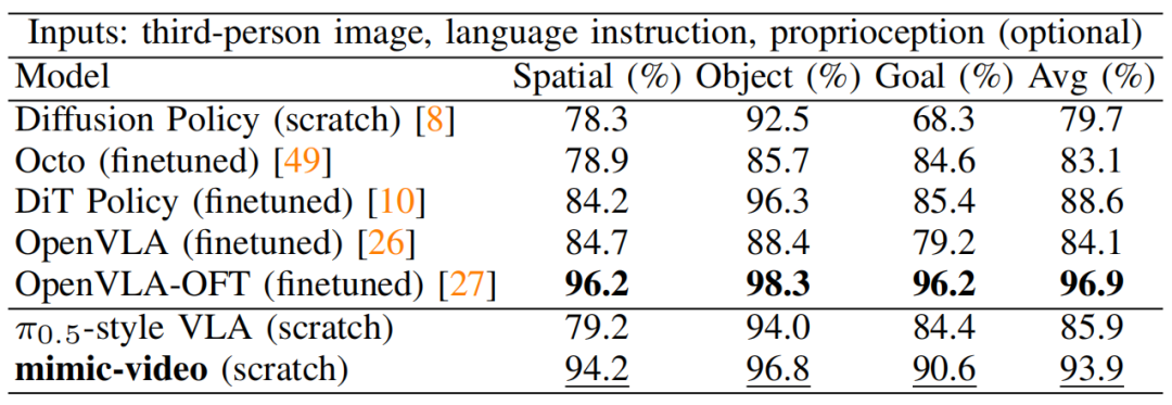 在LIBERO基准的多任务测试中,mimic-video仅通过任务特定数据从头训练,就在空间任务、物体任务和目标任务上分别达到94.2%、96.8%和90.6%的成功率,平均93.9%,大幅超越了同样从头训练的π0.5-style VLA(85.9%),甚至接近部分基于通用模型微调的方法。