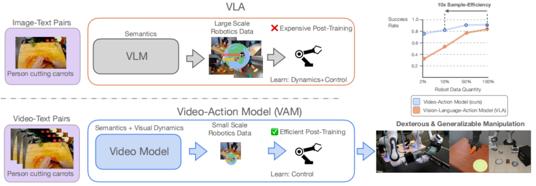让机器人完成“把胡萝卜放进盘子”这类日常操作,远不止理解语言指令那么简单。它必须精准把握物体的运动轨迹、受力特点,甚至轻微的形态变化规律,这些都属于机器人操作的核心物理认知范畴。一直以来,VLA模型始终绕不开一个瓶颈,这类模型的预训练依赖静态图文数据,完全缺乏时间维度的动态信息,导致物理动力学知识只能从零学起。这也导致机器人掌握技能时,必须依赖海量且成本高昂的专家演示数据,严重限制了其落地效率。
