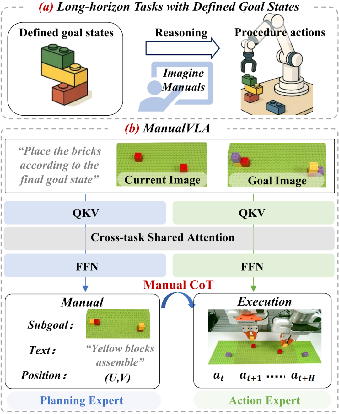ManualVLA的架构设计模拟了人类完成复杂任务的思维模式,将整个过程拆分为"规划"和"执行"两个核心环节: