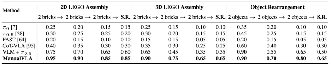 ManualVLA 与基线模型的对比。研究团队采用 20 个未见过的测试目标状态,报告了完整长时程任务的操作成功率(S.R.),同时补充报告了关键中间步骤的成功率。