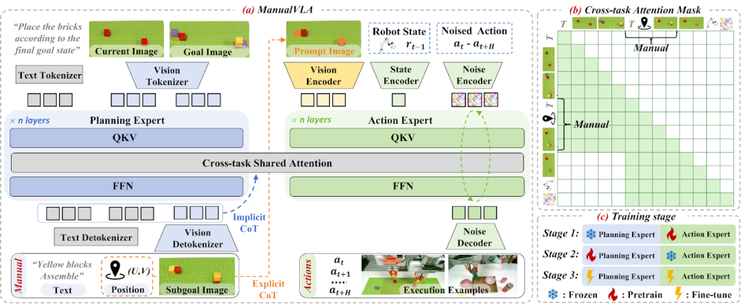 (a)为完成具有明确目标状态的长时程任务,研究团队提出了 ManualVLA—— 一种基于混合 Transformer(MoT)架构构建的统一视觉 - 语言 - 动作(VLA)模型。该框架包含两个专家模块:负责生成多模态操作手册的规划专家,以及负责预测精确动作的动作专家。规划专家对人类指令、当前场景图像和最终目标图像进行处理,生成包含下一步图像、位置信息和子任务指令的中间操作手册。研究团队引入了显式链式思维(CoT)推理过程,其中每个位置指示器都作为视觉提示,嵌入到动作专家的观测信息中。(b)结合跨任务共享注意力机制与设计的注意力掩码,生成的操作手册令牌还被用作动作生成的条件信号,实现了能够有效引导动作专家的隐式链式思维(CoT)推理过程。(c)ManualVLA 采用三阶段训练策略,使规划专家与动作专家实现对齐,从而达成高效协同工作。