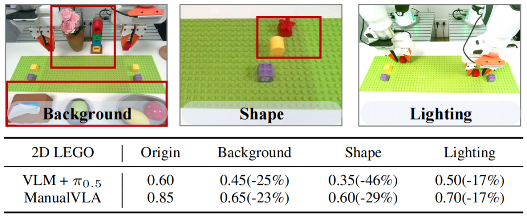 除了在标准场景下的优异表现,ManualVLA还展现出了出色的泛化能力。当面对未见过的物体形状、背景环境和光照条件时,它的性能仅出现小幅下降:在2D乐高组装任务中,背景变化时成功率从85%降至65%,形状变化时降至60%,光照变化时降至70%,而对比基线模型在这些情况下的性能下降更为明显。