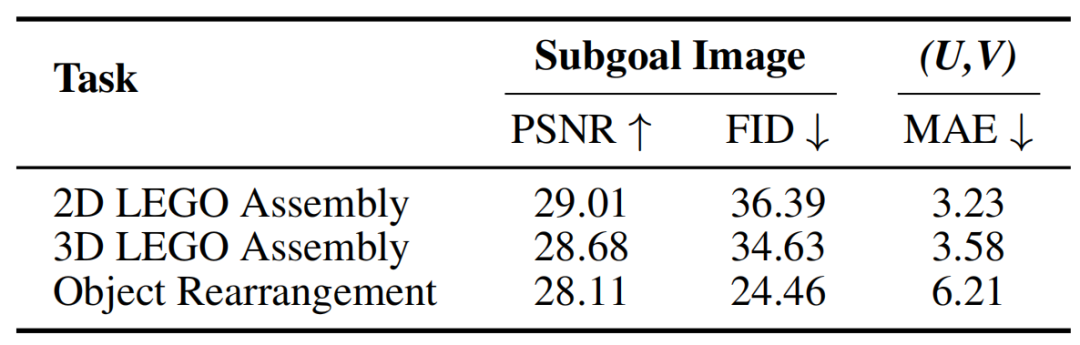ManualVLA 在三项下游任务中子目标图像及(U,V)坐标生成的定量结果