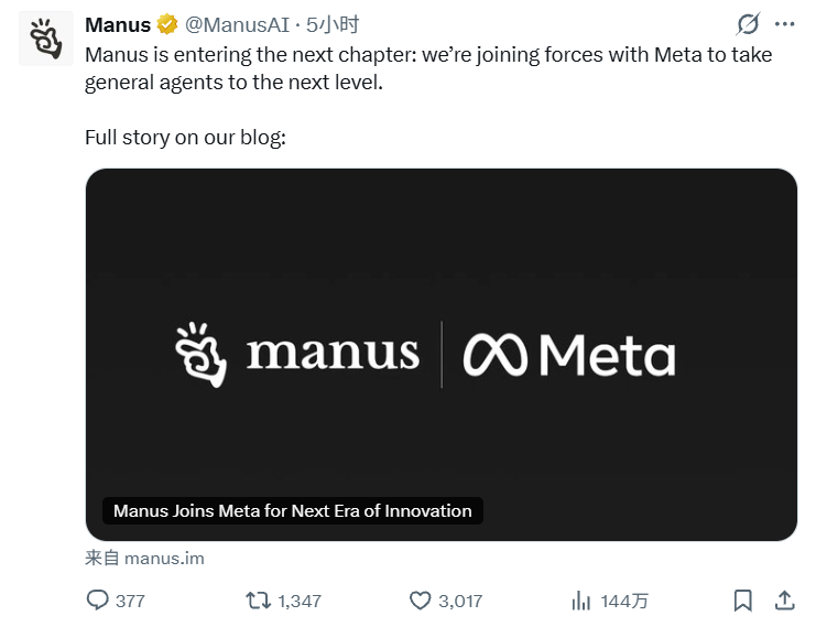 Meta在公告中明确,将Manus的通用智能体技术集成至旗下消费级及企业级产品,包括Meta AI,覆盖全球数十亿用户及数百万企业。Manus的核心能力将与Meta的基础设施、分发网络结合,拓展复杂任务处理场景。