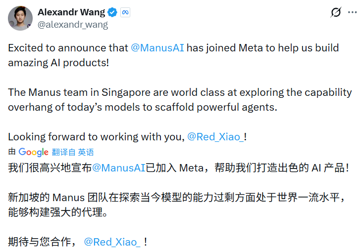 据真格基金合伙人刘元披露,此次收购谈判仅用十余天完成。Meta首席AI官Alexandr Wang在社交媒体表示,Manus团队在模型能力探索方面处于全球领先地位,其新加坡100人核心团队将整体加入Meta,MSL(Meta AI Labs)同步在新加坡扩招。