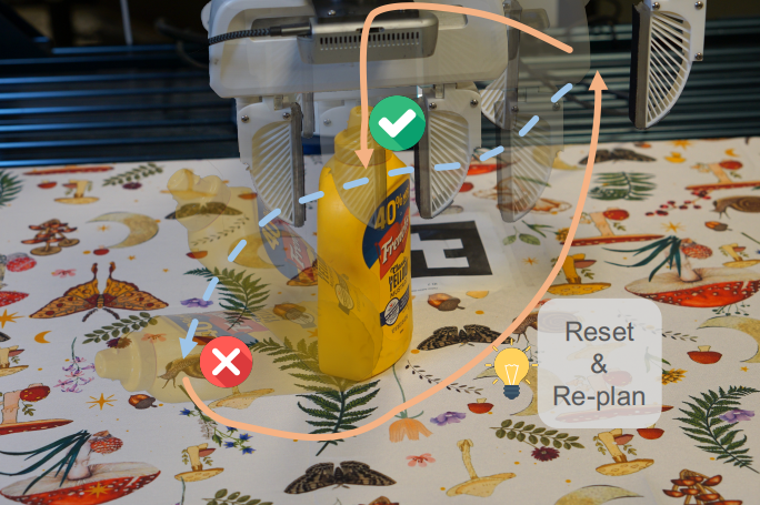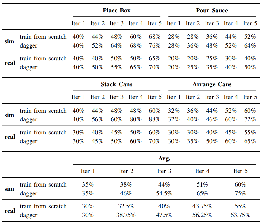 实验表明,在FR3机器人的四项任务中,DAgger迭代训练相比从头训练,性能显著提升,其中"堆叠罐子"任务的真实世界成功率从60%提升至70%,"整理罐子"任务从55%提升至65%。