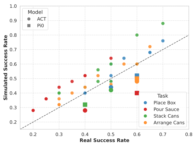 当前机器人策略评估面临着环境不一致的难题:不同场景、光照、相机参数导致的性能差异,往往掩盖了算法本身的进步。GSWorld提供了标准化的基准测试框架:统一的GSDF资产、固定的相机内参/外参、一致的光照和材料属性,以及标准化的动作语义,确保不同机器人、场景、任务间的" apples-to-apples "比较。实验验证了仿真与真实世界性能的强相关性,无论是ACT还是Pi0架构,仿真中的成功率都能可靠预测真实世界表现,为算法迭代提供了精准的评估依据。