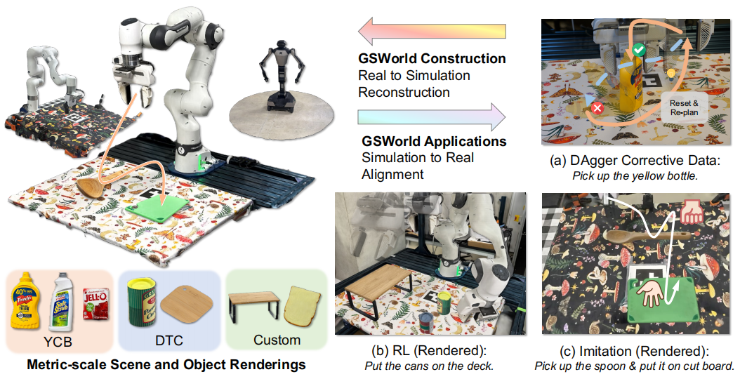 GSWorld 借助 3D 高斯泼溅(3DGS)重建技术渲染照片级真实感机器人场景,支持在仿真环境中采用多种政策学习方案,并实现零样本仿真到现实(sim2real)迁移。此外,GSWorld 还可应用于政策视觉基准测试,以及用于数据采集的虚拟远程操控场景。