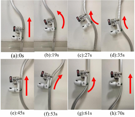 直轨速度略降至0.041m/s,弯道段扭矩需求增大,峰值扭矩达到2.35N·m。尽管如此,机器人依然能稳定完成整个攀爬过程,姿态调整机构有效补偿了额外负载带来的影响。