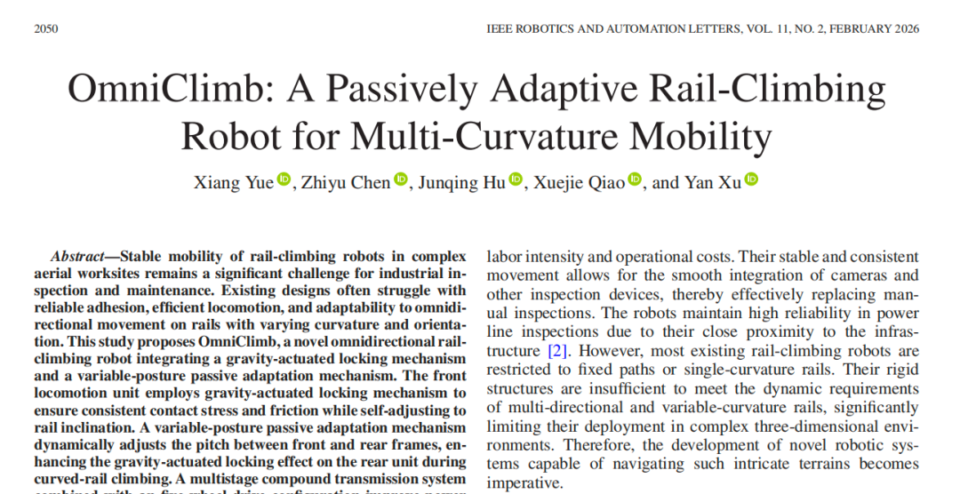 最近,沈阳农业大学工程学院的研究团队在《IEEE Robotics and Automation Letters》上发布了最新成果——OmniClimb轨道攀爬机器人。