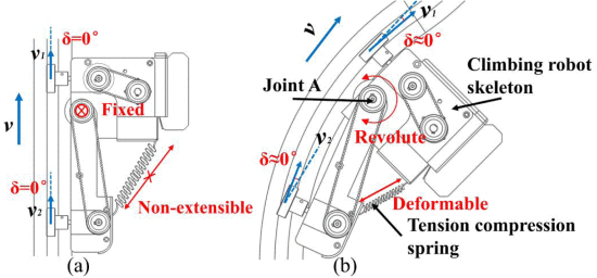 为确保机器人在弯道上也能平稳运行,研究团队设计了可变姿态被动适应机构。机器人的前后车身采用分体式设计,通过铰链连接,中间用姿态调整弹簧约束。当机器人从直线轨道进入弯道时,轨道曲率的变化会使前后车身产生相对旋转。