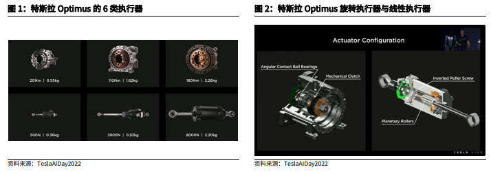 直线电机执行器无需中间传动件,通过定子与动子的电磁力直接推动部件直线运动,可理解为旋转电机“剖开展平”后的形态。特斯拉Optimus人形机器人的应用彰显其“高效精准”优势。该机器人全身28个关节中包含14个线性执行器,分布于大臂、小腿等部位,分为500N/0.36kg、3900N/0.93kg、8000N/2.20kg三类规格,推重比最高达3636N/kg。执行器采用“无框力矩电机+反向行星滚柱丝杠+力传感器”结构,小臂用梯形丝杠、重载部位用滚柱丝杠,定位精度达±0.001mm,响应时间<5ms。