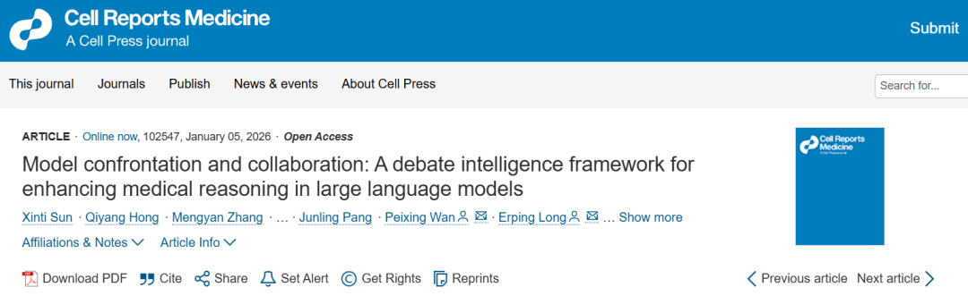 2026 年 1 月 5 日,中国医学科学院基础医学研究所龙尔平团队与北京大学基础医学院万沛星团队,在《Cell Reports Medicine》期刊在线发表题为《Model confrontation and collaboration: a debate intelligence framework for enhancing medical reasoning in large language models》的研究论文。该研究提出 “模型对抗与协作”(MCC)框架,推动医疗 AI 从 “单点智能” 向 “协同推理” 实现范式跃迁;通过构建可辩论、可追溯、动态协作的模型圆桌,从根本上助力医疗 AI 向可靠、可解释、可协作的下一代形态演进。
