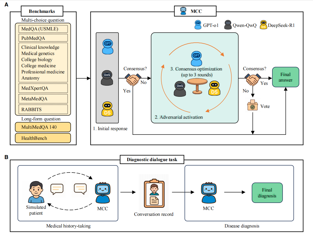 在医学人工智能飞速发展的当下,GPT-4、Med-PaLM 2 等大型语言模型在医学问答与考试任务中持续刷新纪录,展现出逼近人类的认知水平。然而,单一模型固有的“黑箱”局限,以及缺乏多视角校验的推理机制,已成为其在真实、高风险临床场景中安全落地的核心瓶颈。如何让 AI 复刻多学科专家会诊的模式,实现交叉质证与协同决策,是医疗 AI 迈向可信、可靠阶段必须跨越的科学鸿沟。