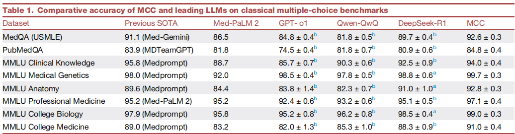 MCC 在各类医学基准测试中表现出压倒性优势,多项指标刷新纪录、稳居 SOTA 水平。经典测试中,MedQA 基准(1273 道题)上 MCC 达到 92.6%(±0.3)的平均准确率,超越 Med-Gemini 此前保持的 91.1% 的最佳纪录,大幅领先于单个模型(GPT-o1 为 84.8%、Qwen-QwQ 为 81.8%、DeepSeek-R1 为 89.7%)和专业医疗模型 Med-PaLM 2(86.5%),且多次独立运行中均展现出稳定表现;PubMedQA 基准中,其 84.8% 的准确率同样超越 MDTeamGPT 的 83.9%,持续领跑。MMLU 医学子集中,它覆盖遗传学、解剖学、临床知识等多个科目,整体准确率维持 90% 以上,其中五个科目更是斩获 SOTA,在医学遗传学领域准确率高达 99.7%,充分彰显跨领域推理能力。
