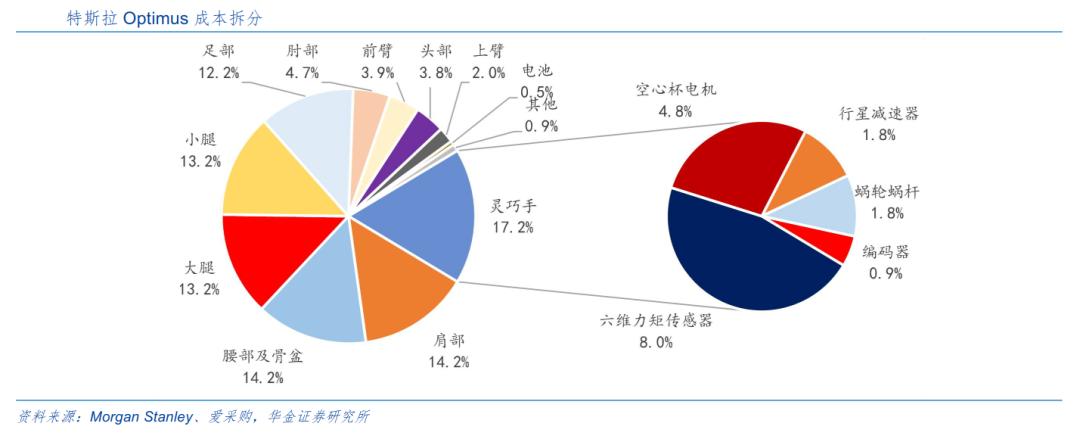 成本方面,灵巧手约占整机成本17%,成本层面灵巧手是整机最重要的部件之一。以特斯拉Optimus为例,从整机各部位的成本拆分来看,灵巧手成本占比约为17.2%,占最大比重,其中空心杯电机、六维力传感器分别占比4.8%、8.0%,行星减速器、蜗轮蜗杆、编码器分别占比1.8%、1.8%、0.9%,空心杯电机与六维力矩传感器是灵巧手中的核心部件。
