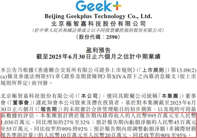 据业绩预告,2025年上半年,该公司预计实现收入为9.95-10.3亿元,同比增长27-32%;预计报告期内公司亏损净额为4500-5500万元,同比大幅收窄90-92%,经调整亏损净额为1000-2000万元,亦大幅收窄90-95%。