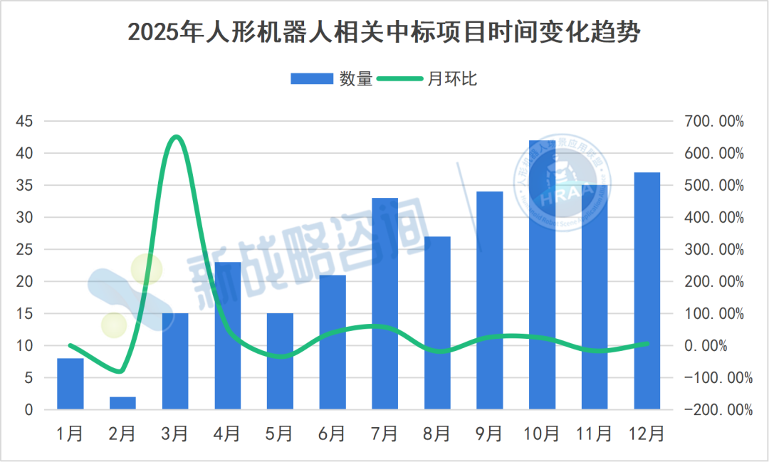从时间分布看,2025年人形机器人中标呈现出明显的阶段性波动。年初1月至2月数量骤降,2月环比下降75%,随后3月出现650%的极端反弹,显示出节假日因素与集中释放项目的叠加效应。