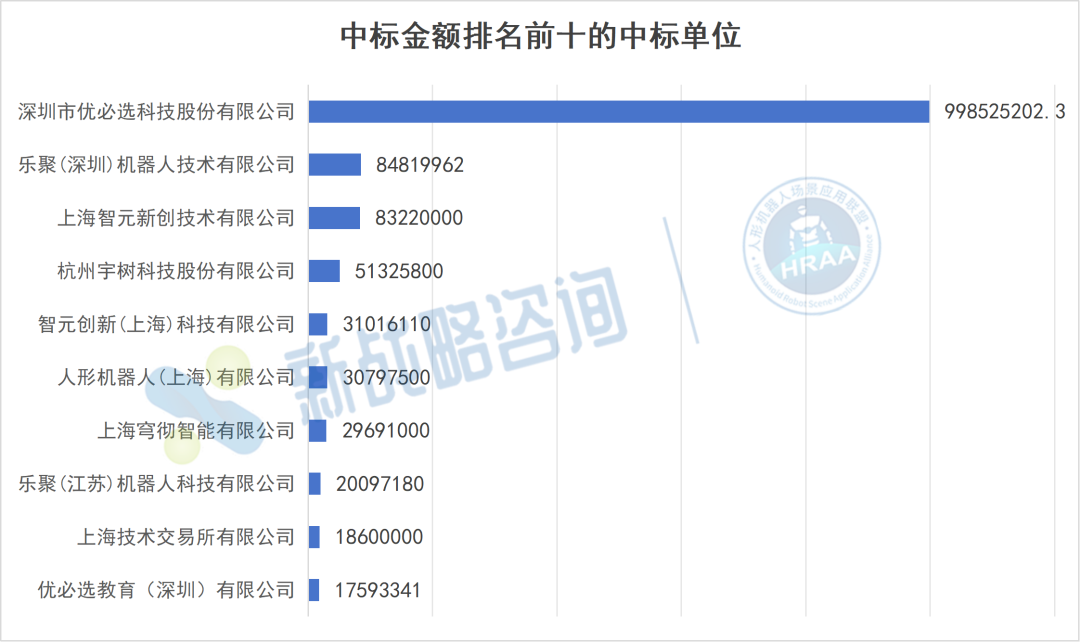 优必选、宇树、朝元时代、乐聚、湖北荆楚等企业在中标次数上构成第一梯队,其中优必选以10次中标领跑,宇树两种主体合计13次,成为出现频率最高的厂商之一。在金额维度上,优必选以近10亿元的中标总额形成显著领先,构成“一超多强”的格局,头部与非头部之间的收入差距已经拉开。