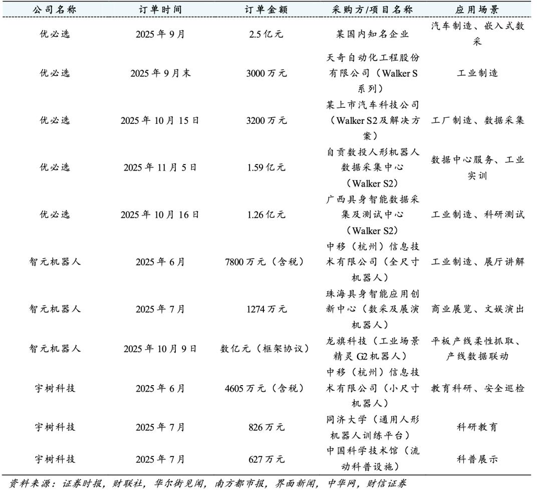 据《财信证券》统计,2025年人形机器人单笔订单金额,最高的是优必选的2.5亿元,其它订单多数在千万元级别。