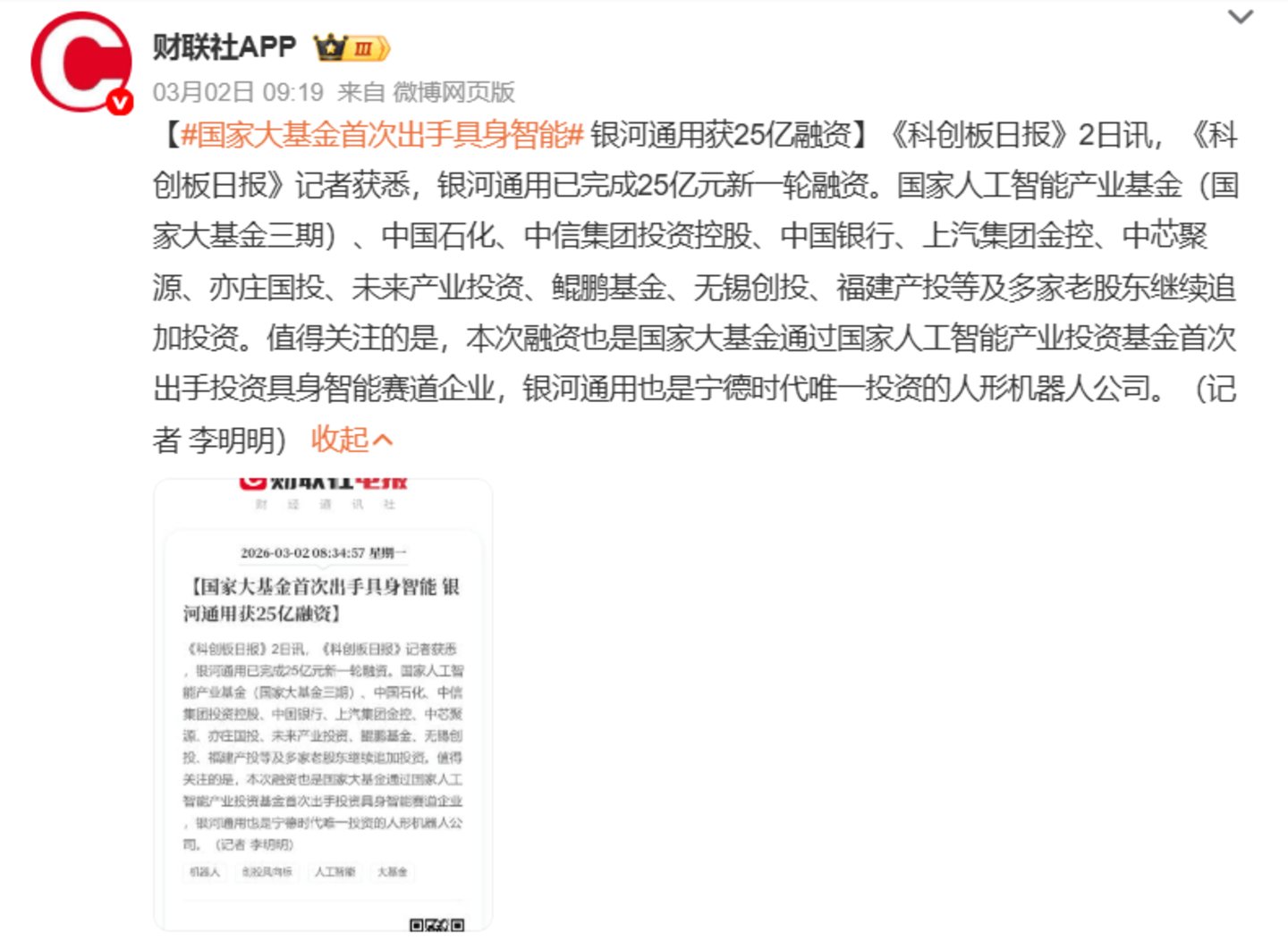 春晚舞台上和蔡明同台演小品的松延动力,完成近 10 亿元 的B 轮融资,由宁德时代系产业投资平台晨道资本领投;和言承旭、王一博跳舞的银河通用完成 25 亿元新一轮融资,投资方包括国家人工智能产业基金(国家大基金三期)、中国石化等,其累计融资额居国内具身智能领域首位,同时凭借30亿美元的估值,成为国内估值最高的具身智能公司。