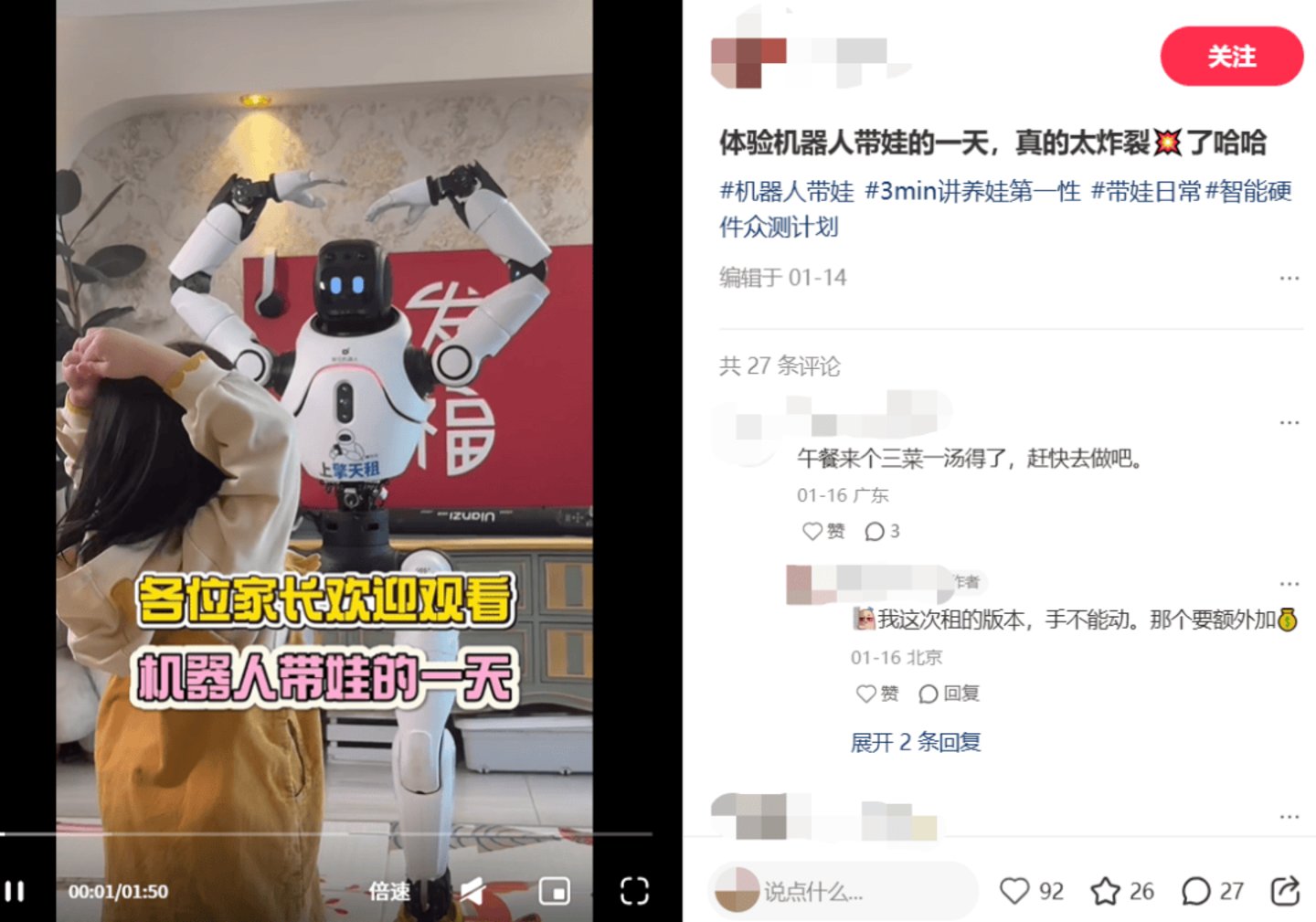 “趣解商业”注意到,除了文旅、演出需求,有不少个人或家庭也在租机器人感受生活人机共处的生活。社交媒体上有不少网友分享“和机器人共度一天”的Vlog。