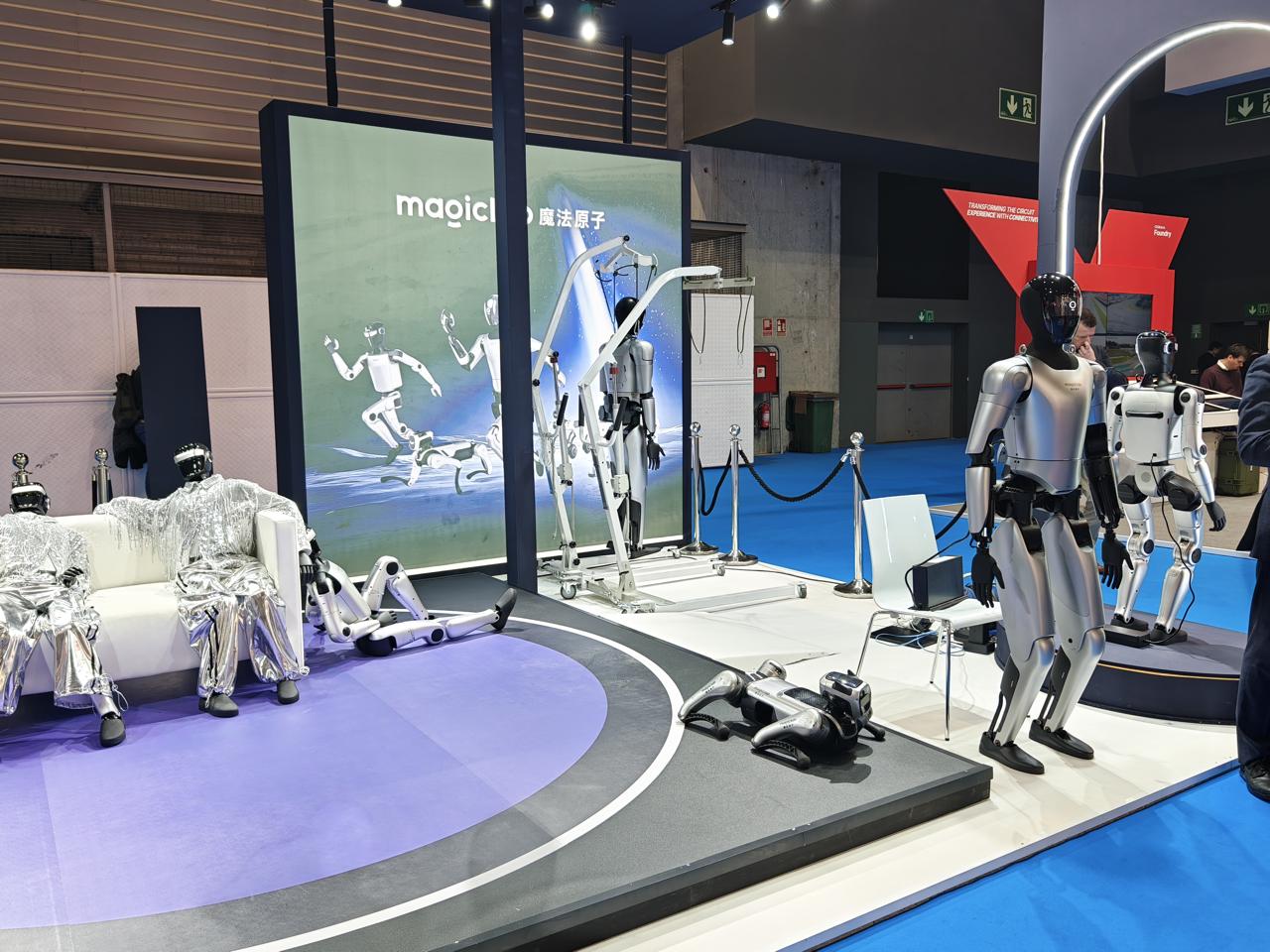 针对人形机器人领域,魔法原子推出的MagicBot Z1,号称「全球首个电驱空翻机器人」,主打表演等娱乐场景应用;另一款MagicBot Gen1,号称「全球首个多机协同作业机器人」,主打生活和工作场景应用。MWC26展台,MagicBot Gen1就以「导购员」身份亮相,与全球客商互动,并可在西班牙语和英语间流利切换。