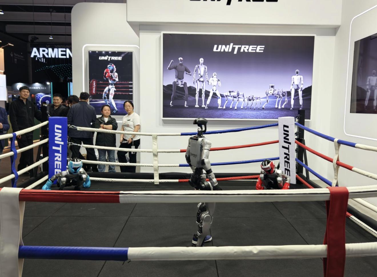 在CES 2026和MWC26舞台,宇树同样继续大走「表演秀」的路子,展位的绝大部分区域,都被设置成可供路人观众欣赏的人形机器人「搏斗竞技场」。