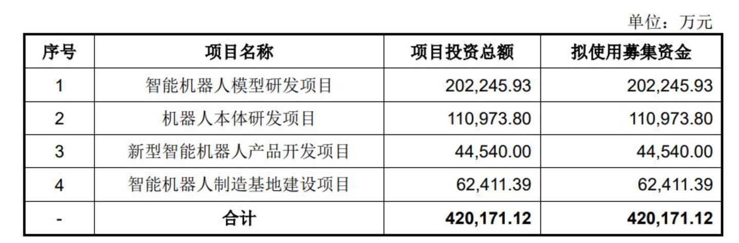 根据招股书显示,宇树本次融资总额为42.02亿元,具体分为智能机器人模型研发20.22亿元、机器人本体研发11.10亿元、新型智能机器人产品开发4.45亿元、智能机器人制造基地建设6.24亿元,共计四个项目。从募资分配计划中不难看出,做机器人模型是宇树当下最重要的任务。