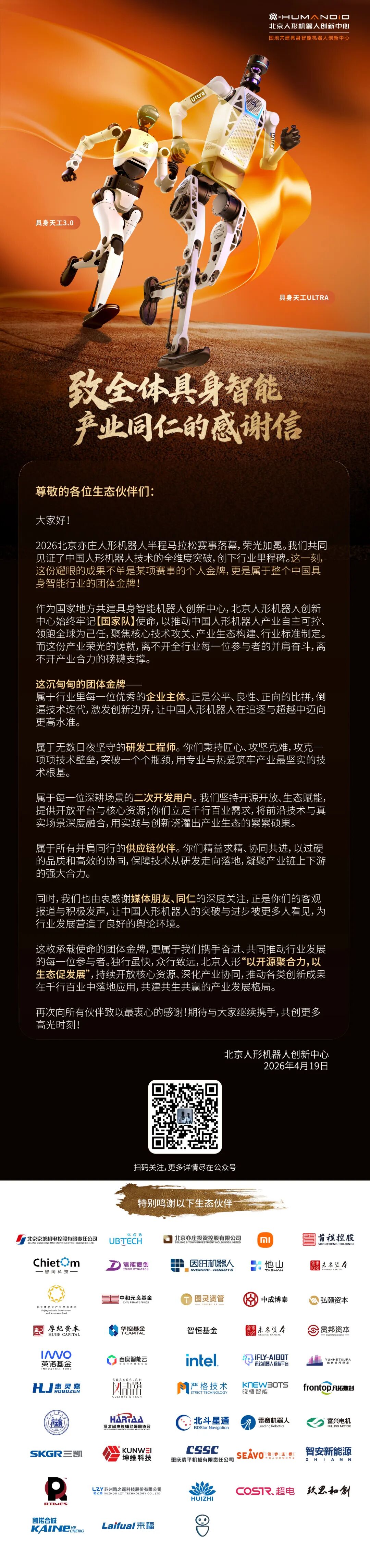 这枚金牌,没有专属的唯一得主,它属于中国具身智能产业里的每一位躬身入局者。正如北京人形创新中心在感谢信中所言,这枚团体金牌,属于每一家深耕技术的企业主体、每一位在实验室与赛道上日夜打磨的研发工程师、每一位深挖场景价值的二次开发用户、每一个筑牢产业根基的供应链伙伴,也属于每一位坚守客观立场、记录行业成长的媒体同行。(感谢信请查看文末)