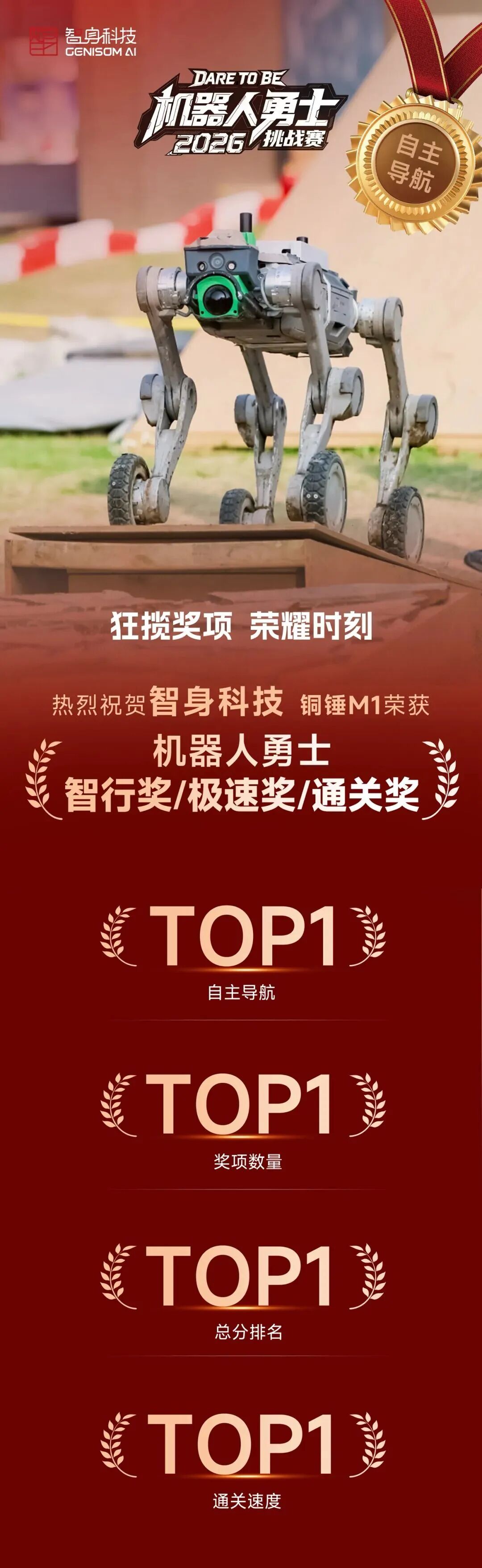 遥控尚且艰难,自主更是稀缺。也正是在这里,智身科技的铜锤 M1 把“自主”这件事,做成了赛事里最硬的一次能力宣言。作为唯一一支参与全部三项赛事的队伍,智身科技在勇士挑战赛中拿下机器人勇士智行奖、通关奖、极速奖等六个奖项,斩获四足机器人自主导航大类总分第一、奖项数第一、速度第一。其中,智身此次最值得被反复讨论的正是在最难的自主导航项目中,把“第一、唯一”做成了一次足够鲜明的能力证明。