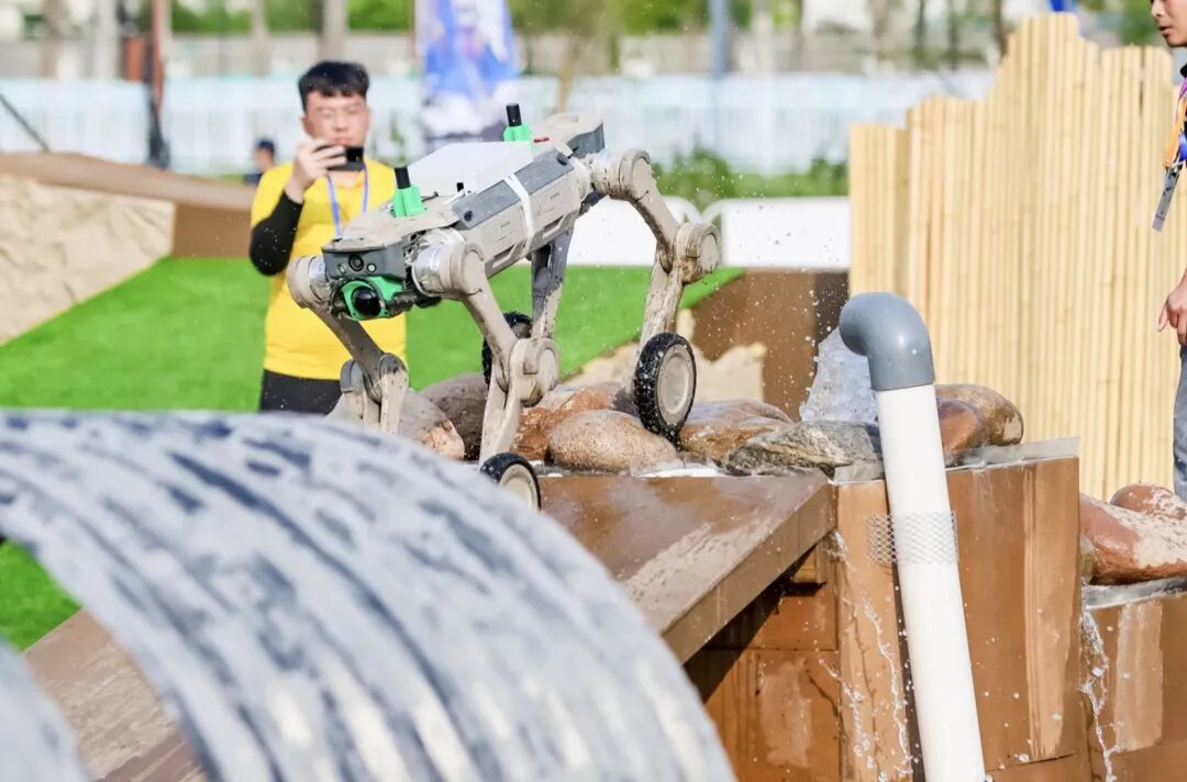 比如狭道闯关里,机器人要先通过旋转平台,再踩着仅 15 厘米宽的独木桥前进,几乎是在“走钢丝”;管道通行里,弱光环境与定位信号受扰,又逼着它在不完整信息下完成稳定导航;涉水越障中,鹅卵石和大石块在流水冲刷下会打滑、晃动、卡腿,侧向水流又不断打破稳定性。这些都不再是某一个单点功能的比拼,而是在逼机器人实时感知环境、快速做出决策,并在动态世界里维持动作与重心的统一。