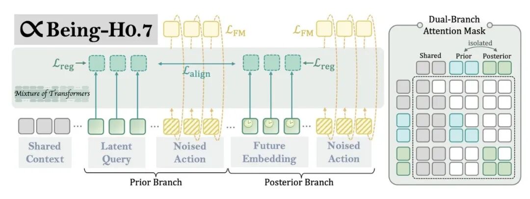 第二步:引入双分支未来对齐机制然而,仅凭第一步还远远不够。如果只依靠动作监督信号进行学习,这些潜在查询向量极易退化成一个毫无物理深度的浅层特征聚合器,根本无法真正具备“世界模型”的预判能力。