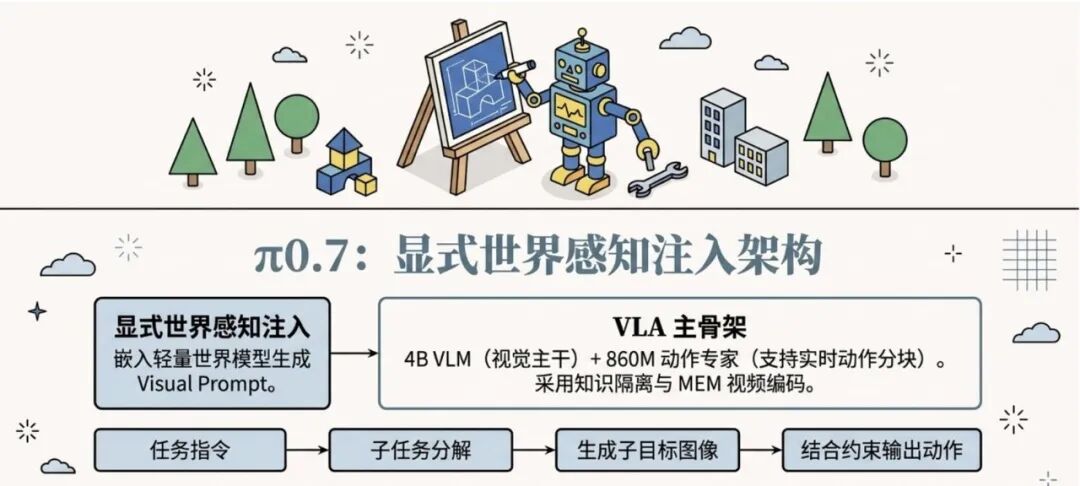 π0.7 不要求主模型自己去顿悟物理世界。它通过架构上的解耦,将对未来的想象显式化为真实的像素图像,将对动作好坏的反思显式化为文本标签。